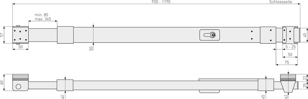 - Bewegliches Riegelrohr für individuelles Anpassen an Türbreiten zwischen 780 und 1040 mm